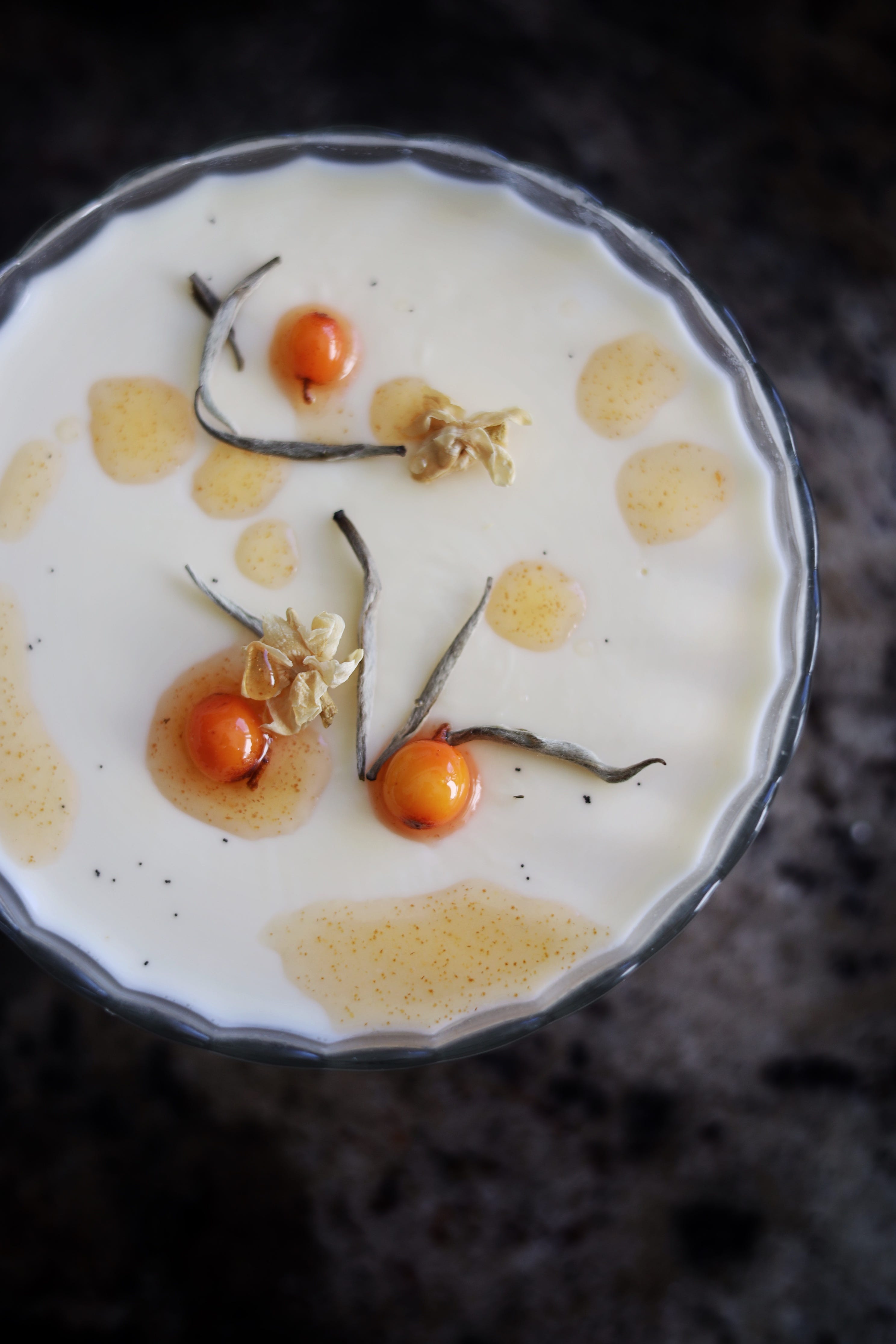 Fujian jasmine white tea, Réunion vanilla, Ramsgate sea buckthorn panna cotta.